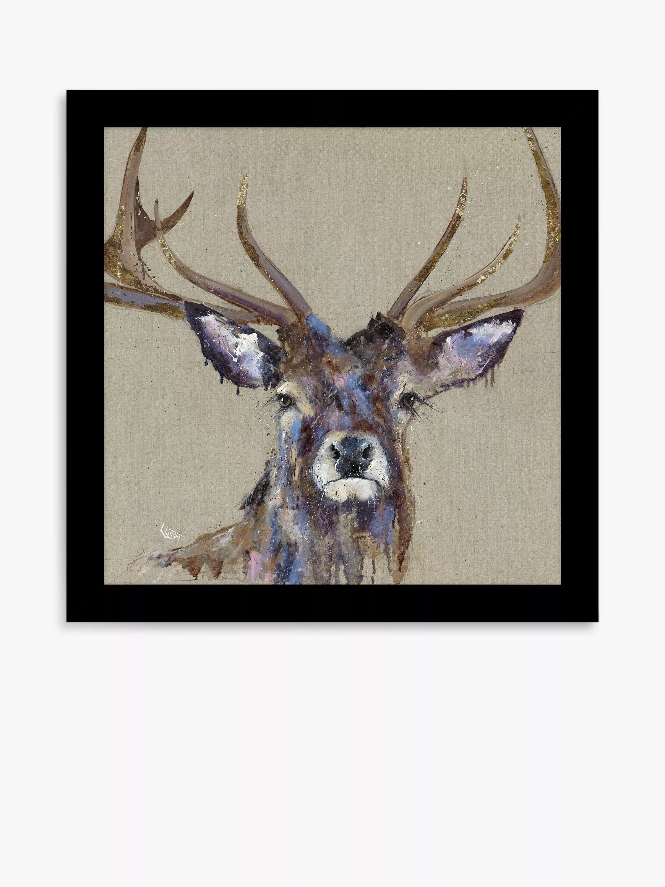 Un cerf majestueux, œuvre de l'artiste Louise Luton. Réalisée au Royaume-Uni, cette estampe est rehaussée d'une finition acrylique texturée, créant un effet subtil en surface. Encadrée, elle est prête à être accrochée.