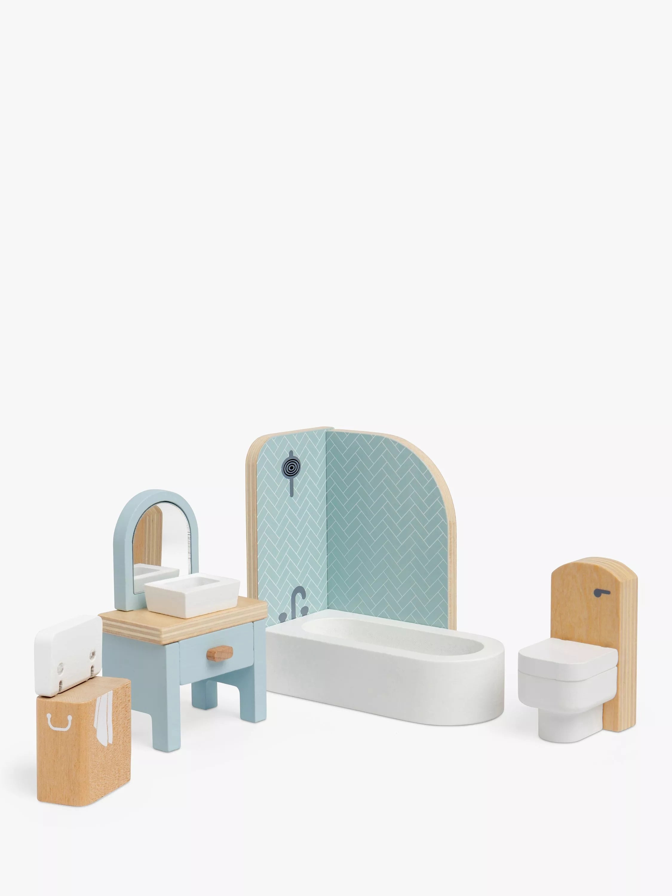Cet ensemble de cinq pièces présente des détails réalistes, comme des carreaux de brique au mur. Décoré avec beaucoup de bois naturel et des nuances de bleu pâle, il contient tout ce dont votre famille miniature aura besoin : une baignoire et une douche, des toilettes, un lavabo avec miroir et un panier à linge.