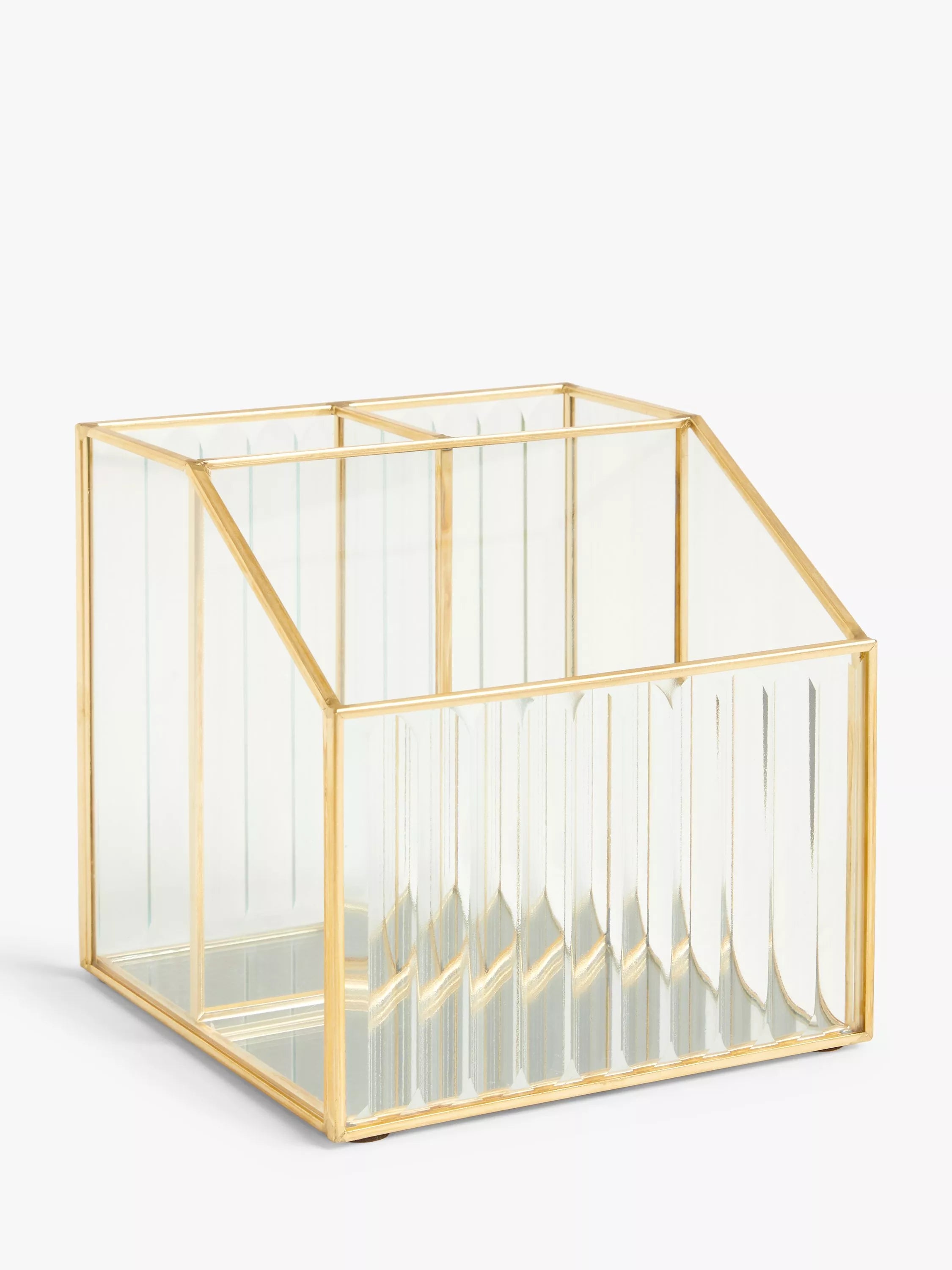 Avec son design moderne en verre et ses magnifiques détails dorés, cet organiseur est idéal pour ranger votre maquillage et vos pinceaux.