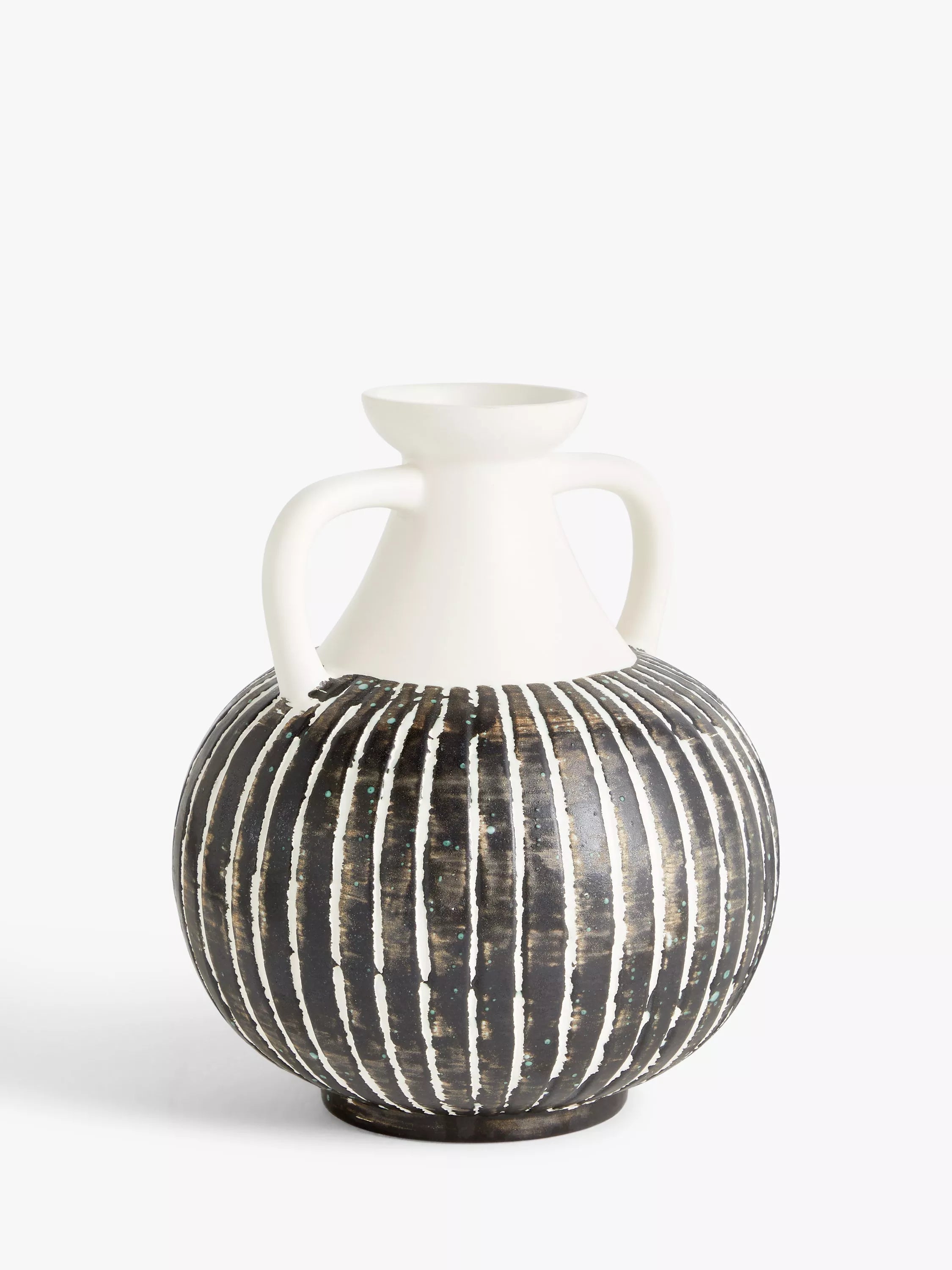 Apportez une touche d'élégance grecque antique à votre intérieur avec ce vase en faïence aux rayures saisissantes. Son design unique en fait une pièce maîtresse, idéale pour ajouter une note de sophistication à n'importe quelle pièce. Ce magnifique vase est un accessoire polyvalent, parfait pour mettre en valeur des fleurs fraîches ou comme élément décoratif à part entière.