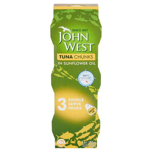 John West offers a trusted canned tuna staple, famous for quality since 1952. This convenient multipack provides three portions of classic tuna chunks preserved within rich sunflower oil. These readily available portions are ideal for supplementing your weekly meal planning with essential pantry staples.