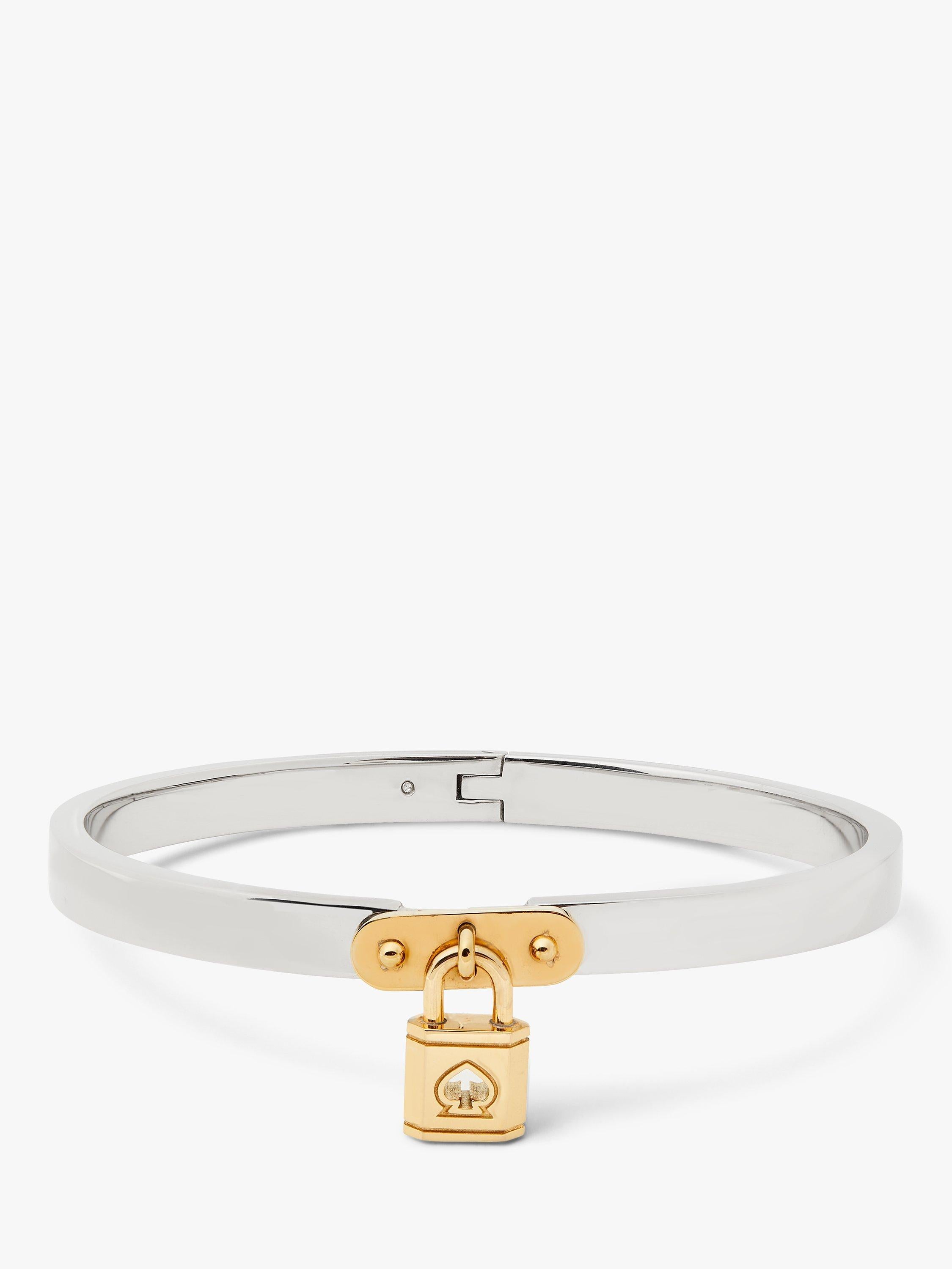 Discover the Kate Spade New York Lock Charm Bangle in a striking Silver Gold finish. This elegant accessory showcases the brand's distinctive spade cut-out detail centrally placed within a charming lock motif. The robust, hinged bangle fastens securely using an easy push clasp mechanism for effortless daily wear and removal, adding subtle, refined luxury.