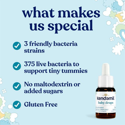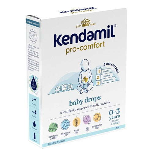 Kendamil Pro-Comfort Baby Drops provide scientifically supported friendly bacteria designed for gentle digestive care. Crafted with 60 years of heritage in infant nutrition, these drops offer targeted support for your baby's needs.