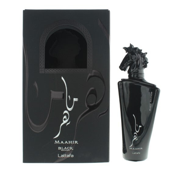 Informations produit : Maahir Black Edition, lancé en 2019, est un parfum ambré épicé unisexe de la marque Lattafa Perfumes.