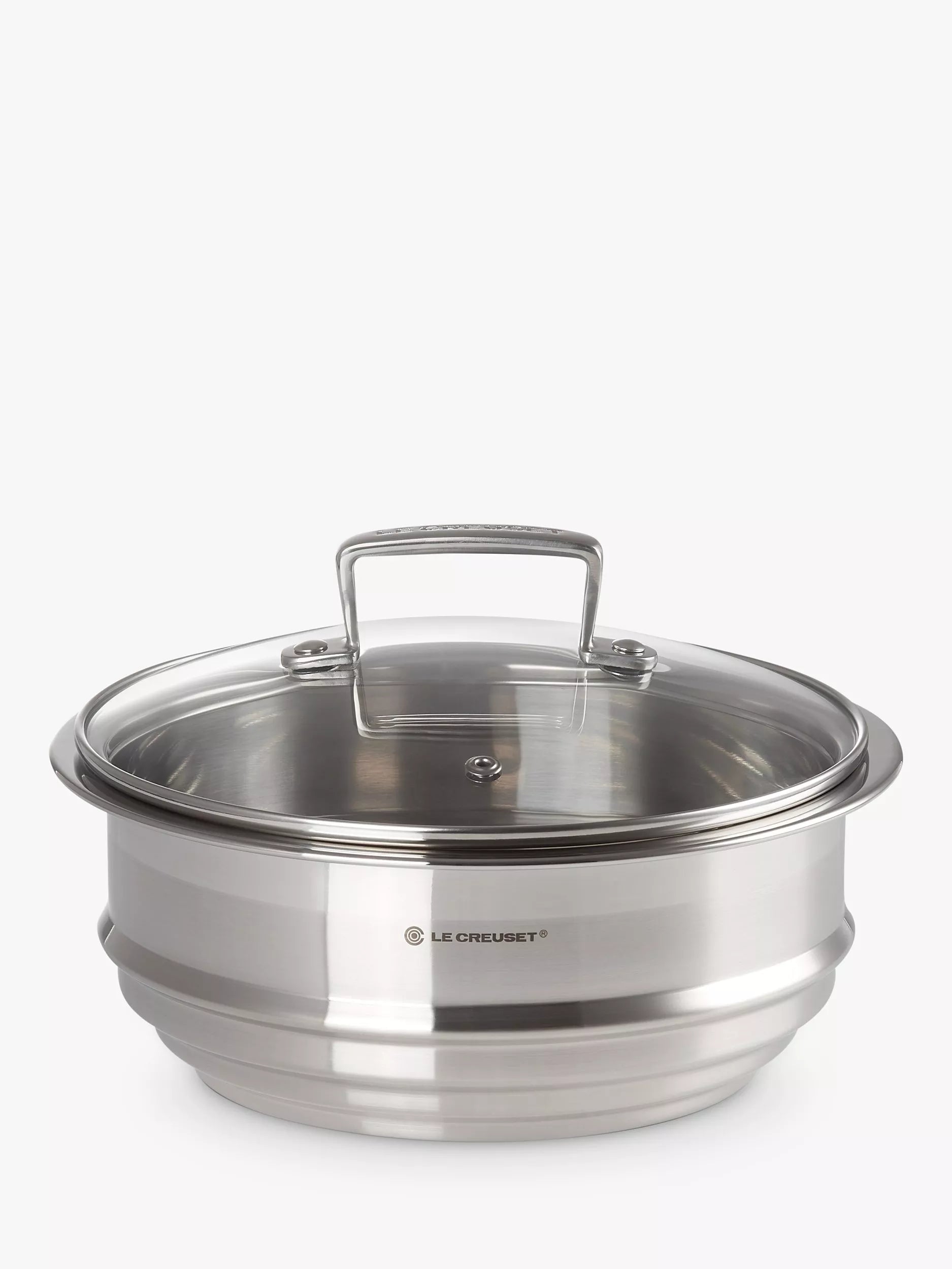 Un panier vapeur et un couvercle en verre résistant à la chaleur, compatibles avec la gamme Le Creuset en acier inoxydable 3 plis. Sa conception étagée s'adapte à toutes les casseroles Le Creuset en acier inoxydable 3 plis de 16, 18 et 20 cm de diamètre et permet d'utiliser plusieurs paniers vapeur.