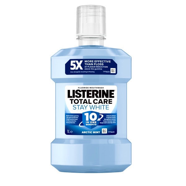 Conçu pour aider à conserver des dents naturellement blanches, le bain de bouche Listerine Total Care Stay White est 5 fois plus efficace que le fil dentaire pour réduire la plaque dentaire* et réduit l'accumulation de plaque jusqu'à 56 % de plus que le brossage seul pour une hygiène bucco-dentaire complète. Le bain de bouche Listerine offre 10 avantages en 1 ; 1. Protection antibactérienne 12 h : Pour une hygiène bucco-dentaire optimale. 2. Agit sous la gencive : Réduit la plaque dentaire sous la gencive. 3. Nettoie entre les dents : Agit dans les zones difficiles d'accès. 4. Renforce l'émail : Contient du fluorure pour renforcer les dents. 5. Prévient le tartre : Contient du chlorure de zinc pour prévenir le tartre. 6. Protection des gencives : Élimine les germes responsables de la plaque dentaire pour des gencives saines. 7. Protection contre les caries : Renforce l'émail des dents pour les protéger des caries. 8. Réduit la plaque dentaire : Réduit la plaque dentaire jusqu'à 56 % de plus qu'un brossage seul. 9. Prévient l'accumulation de tartre pour des dents naturellement blanches. 10. Haleine fraîche : Procure une haleine fraîche jusqu'à 24 heures.