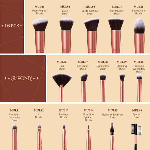This comprehensive 16-piece set contains professional tools necessary for achieving a refined cosmetic appearance. It is structured to handle all application needs, including foundation, contouring, blending colours, eye makeup shading, and precise highlighting.