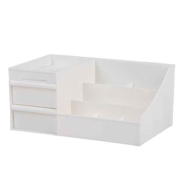 Les deux tiroirs de gauche coulissent en douceur pour une utilisation simplifiée. Conçu avec plusieurs compartiments pour une organisation optimale. Fabriqué en plastique inodore et résistant, facile à nettoyer. Caractéristiques : Dimensions : 28 cm (L) x 17 cm (P) x 13 cm (H) ; Type de produit : Organisateur de maquillage ; Matériau principal : Plastique ; Type de fixation : Autoportant ; Compartiments : Oui ; Tiroirs inclus : Oui ; Nombre de tiroirs : 2 ; Finition : Blanc. Contenu de l’emballage : 1 organisateur de maquillage. Caractéristiques de l’emballage : Dimensions de l’emballage (L x P x H) : 29 x 19 x 14 cm ; Poids brut : 0,48 kg.