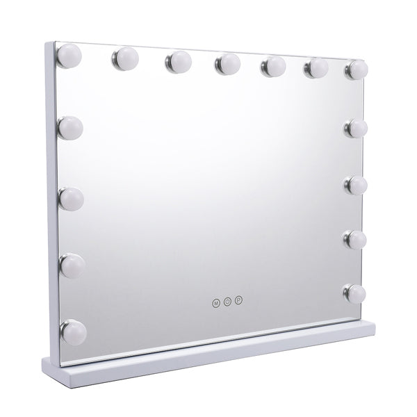 Réglage tactile intelligent, simple et intuitif. Socle détachable, flexible et pratique. Matériaux de haute qualité pour une reproduction des couleurs et une définition optimales. Grand miroir (58 x 45,5 cm) offrant un champ de vision élargi. Dimensions totales : 58 cm (L) x 10 cm (P) x 48 cm (H). Type de fixation : Autoportant. Matériau du cadre : Métal. Alimentation : USB. Type d'ampoule : LED. Nombre d'ampoules : 15. Couleur du cadre : Blanc.