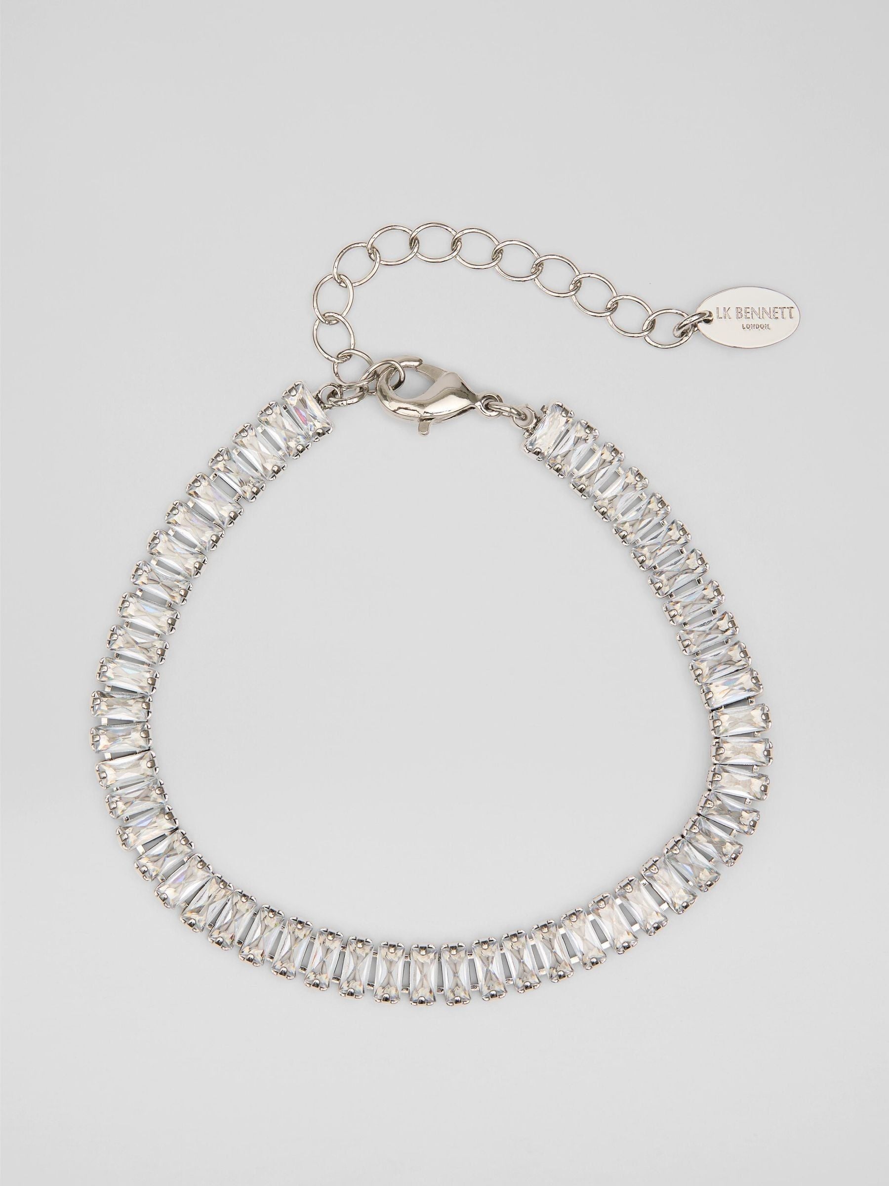 Complete your ensemble with our BR Loura baguette crystal bracelet, a dazzling jewellery accessory crafted from crystal and rhodium plating with brass and cubic zirconia stones that catch the light with every movement.