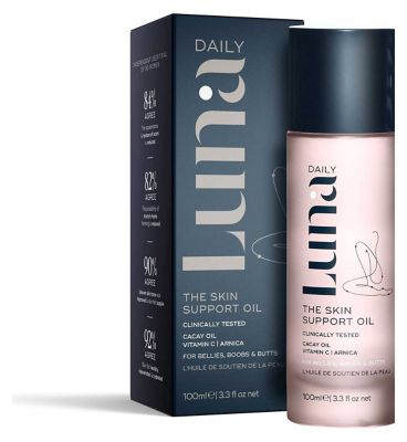 Luna Daily Motherhood The Skin Support Oil is an essential body treatment formulated to address skin changes during motherhood. This daily oil works to visibly decrease the look of stretch marks and areas of uneven skin tone. It is clinically verified and safe for use throughout pregnancy, offering comprehensive skin maintenance.