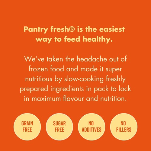 This Marleybones wet food offers a nutritious meal prepared using the convenient Pantry fresh® method. Ingredients are slow-cooked immediately after preparation to lock in goodness and ensure high nutritional value. This recipe combines quality chicken with selected superfoods and essential vegetables for your dog's diet.