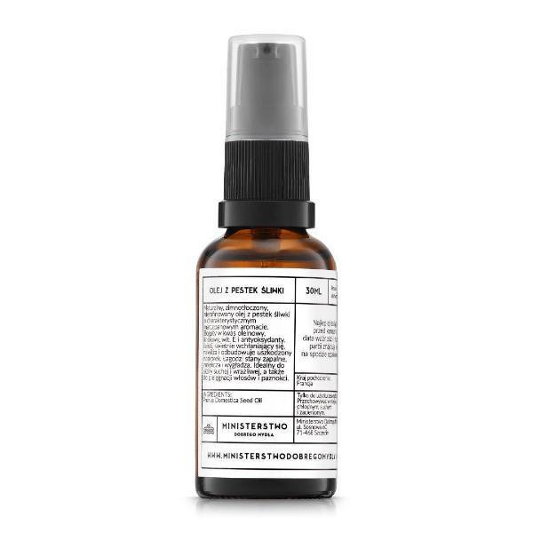 L'huile de pépins de prune, riche en acide oléique, en acide linoléique et en vitamine E, pénètre rapidement et possède un parfum de massepain. Elle hydrate en profondeur, apaise la peau sèche, la protège de la déshydratation, atténue les imperfections et nourrit les pointes fourchues et les ongles cassants.