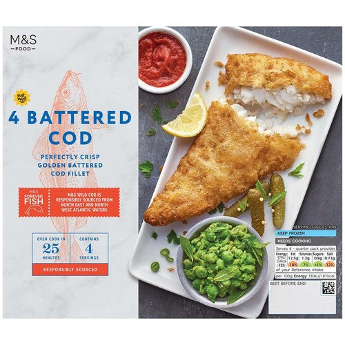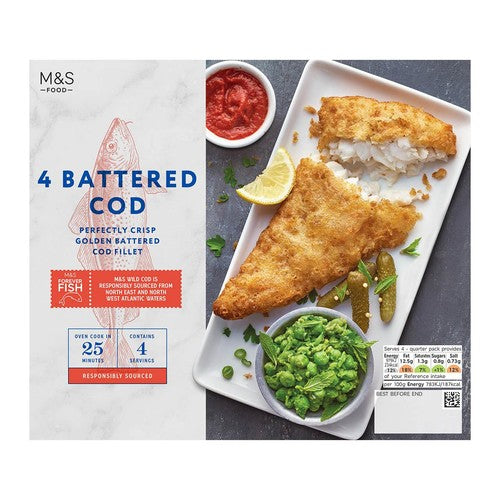 M&S offers four classic cod fillets, each encased in a perfectly crispy and golden batter for authentic flavour. These substantial portions are designed to serve four people, making them ideal for family meals or entertaining guests. Preparation is straightforward as these fillets are ready to cook directly from frozen, offering excellent convenience for busy schedules.