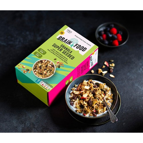 This M&S Brain Health Granola is formulated with a blend of grains, fruits, seeds, and nuts. It combines oats, puffed rice, and barley flakes with sweet apple pieces and raisins for texture. This breakfast option is suitable for vegans and contains no added sugar, supporting a balanced diet.