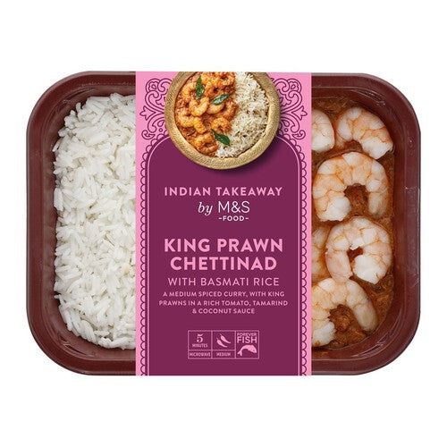 Enjoy the rich flavours of South India with this MS King Prawn Chettinad. This ready meal combines succulent king prawns in a vibrant, spicy curry sauce served alongside fragrant basmati rice.