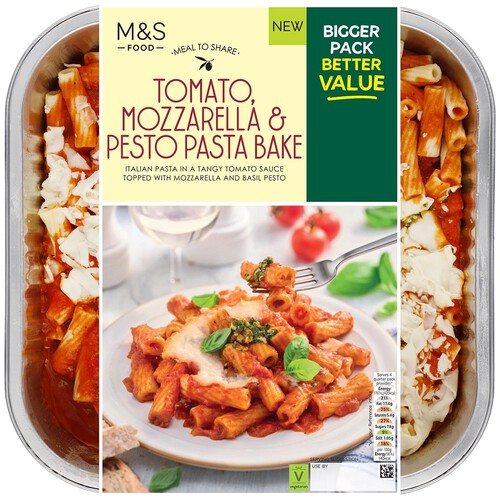 Enjoy this satisfying M&S Tomato Mozzarella & Pesto Pasta Bake for an easy Italian-inspired meal. This dish features cooked Italian pasta coated in a rich tomato sauce, offering reliable flavour.