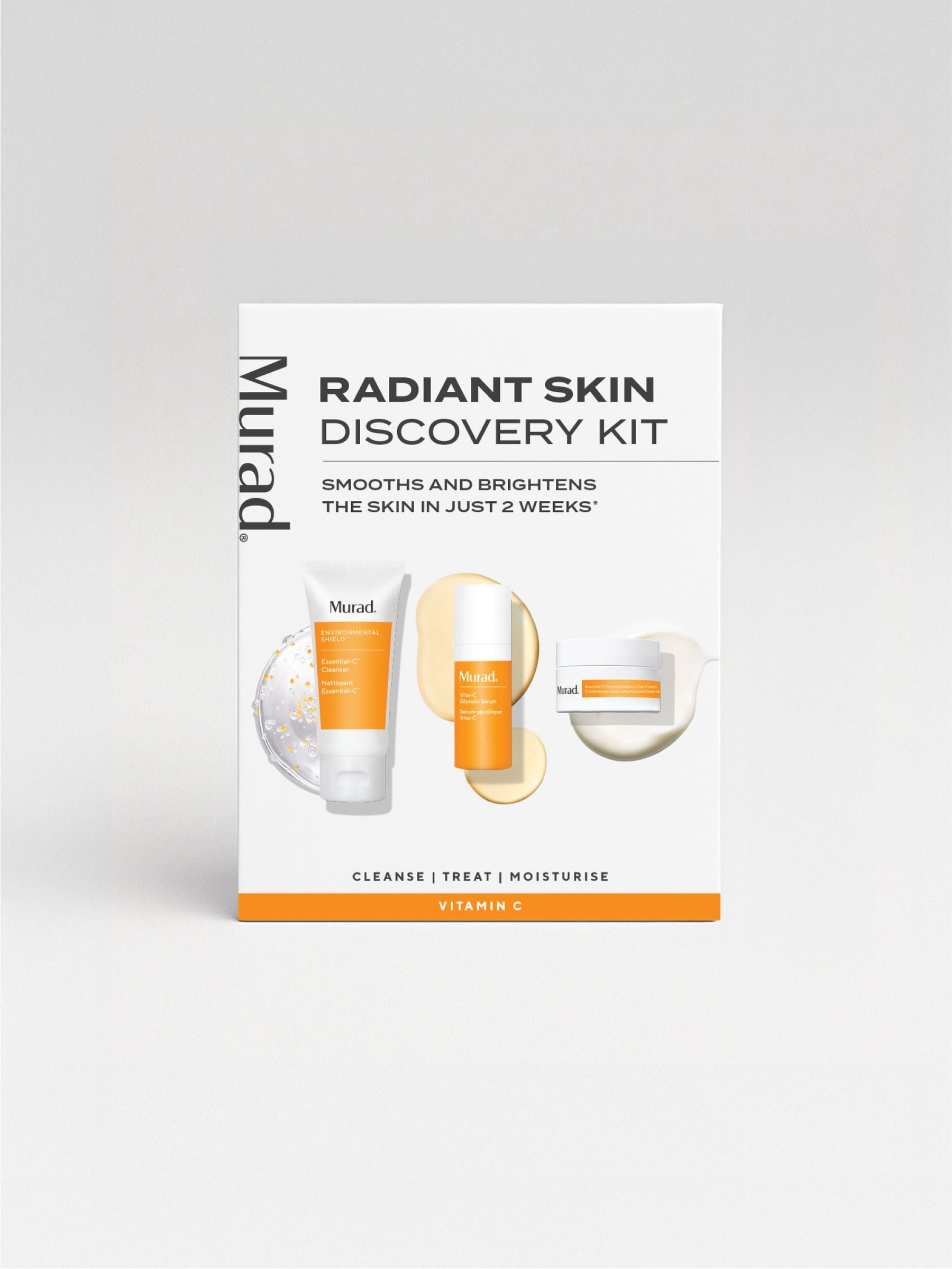 Obtenez un teint éclatant instantanément avec le Kit Découverte Peau Éclat de Murad. Il contient les essentiels iconiques à la vitamine C pour une routine antioxydante de base qui booste l'éclat, illumine le teint et atténue l'apparence des taches brunes en seulement 2 semaines. NETTOYANT ESSENTIAL-C : Un gel nettoyant énergisant à la mousse douce qui élimine la pollution et les impuretés tout en révélant un teint plus lumineux. RÉSULTAT : Un teint plus lumineux, plus lisse et plus uniforme. SÉRUM ÉCLAIRCISSANT À L'ACIDE GLYCOLIQUE VITA-C : Un sérum quotidien haute technologie, à la vitamine C, qui favorise un teint plus lumineux et prévient l'hyperpigmentation, le teint terne et les irrégularités du teint. RÉSULTAT : Un teint plus lumineux et plus lisse en seulement 2 semaines. CRÈME DE JOUR ÉCLAT FERMETÉ ESSENTIAL-C : Une crème hydratante quotidienne légère à la vitamine C et aux céramides, qui booste l'éclat et hydrate pour une peau repulpée et éclatante. RÉSULTAT : Un teint plus lumineux en seulement 4 semaines et une hydratation immédiate.
