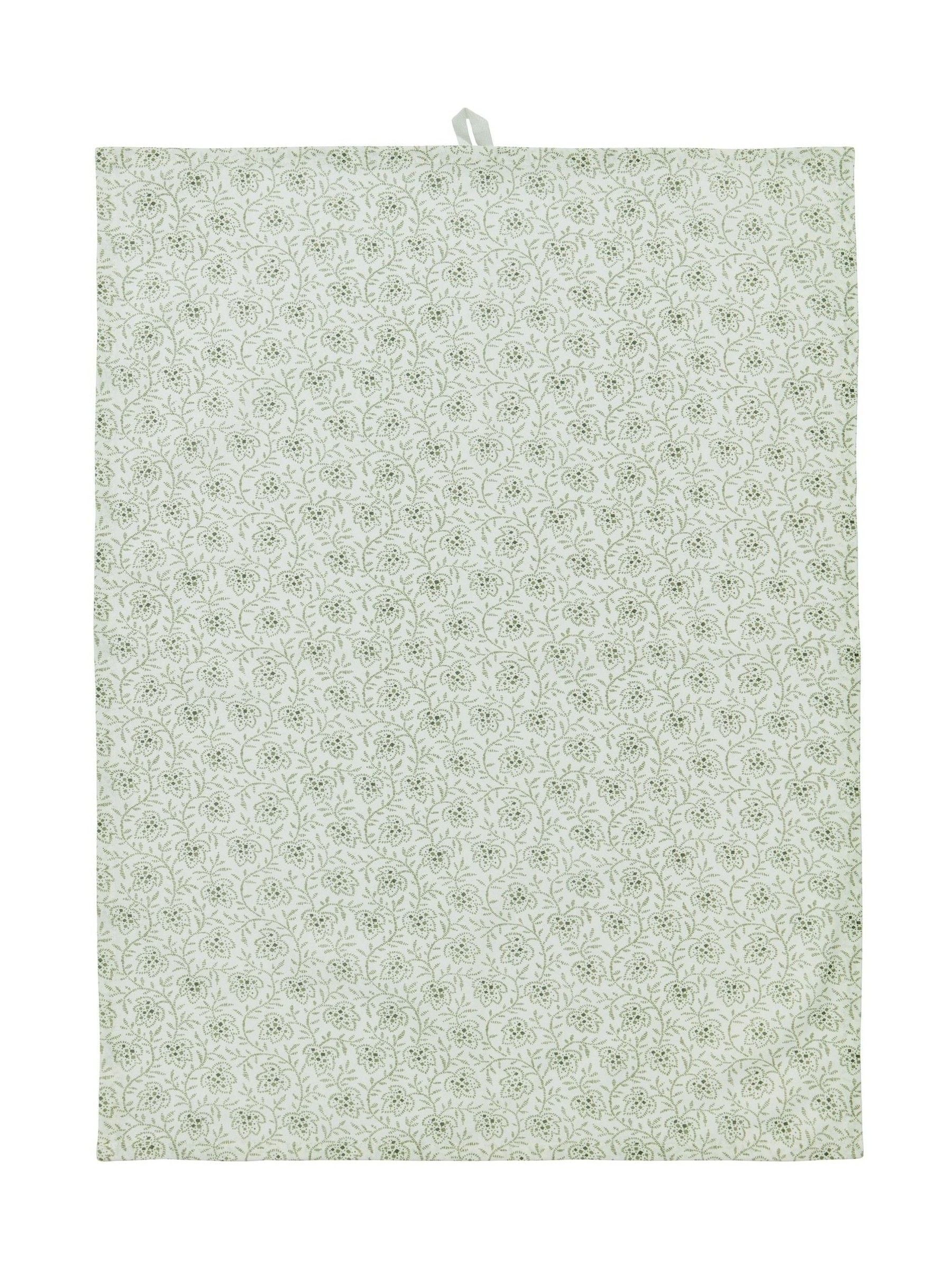 Un ensemble de deux torchons, l'un orné d'un motif de vigne vert sauge, l'autre d'un motif à carreaux teint en fil, tous deux munis d'une boucle de suspension.