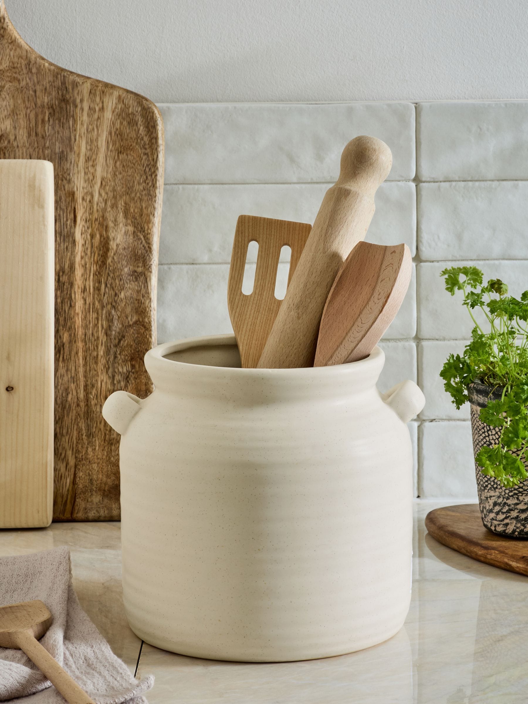 A statement XL ceramic utensil pot with throw line detailing, ideal for keeping your cooking utensils within reach whilst adding a stylish and classic touch to your kitchen.