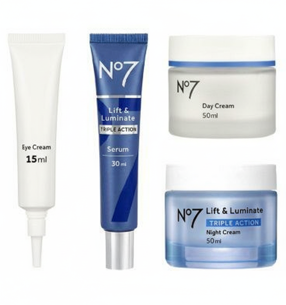 This No7 Lift & Luminate Skincare Regime provides a complete routine using proven Triple Action technology. The set combines four essential products for addressing visible signs of ageing across the entire face and delicate eye area. This collection supports skin's lifting, firming, and overall radiance throughout day and night cycles.