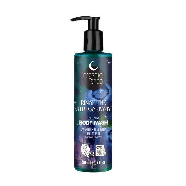 Gel douche relaxant, 280 ml. Dites adieu au stress ! Le parfum apaisant de la lavande, les bienfaits nourrissants de la myrtille et la mélatonine agissent en synergie pour revitaliser votre peau et créer une atmosphère relaxante propice à un sommeil profond et réparateur. Certifié vegan par la Vegan Society. Issu de la collection de soins corporels Dreamy Nights de Organic Shop, ce gel douche est formulé à base de lavande, de myrtille et de mélatonine pour une relaxation et un bien-être absolus.