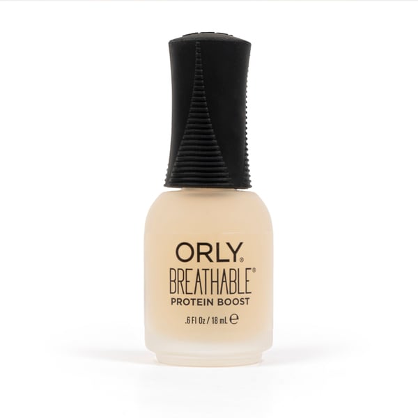 La formule végétale de Orly Breathable Protein Boost, enrichie en protéines de jojoba et de pois, renforce les ongles et prévient le dédoublement et le pelage.