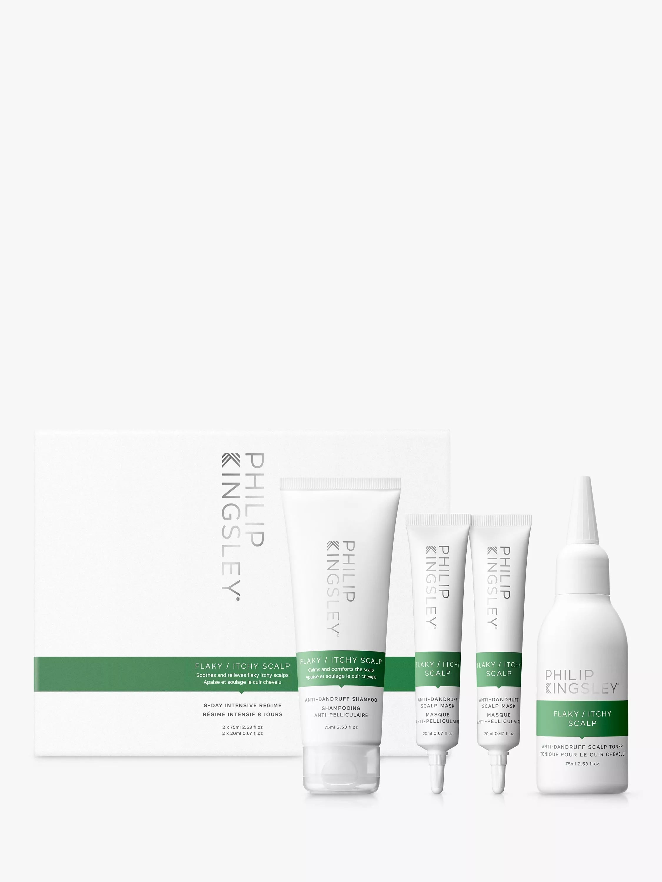 Dites adieu aux pellicules et aux démangeaisons du cuir chevelu avec le Kit 8 Jours Philip Kingsley pour Cuir Chevelu Anti-Pellicules et Démangeaisons – un traitement intensif aux résultats visibles. Ce programme en trois étapes convient à tous les types de cheveux et apaise les irritations du cuir chevelu, pour des cheveux sains et éclatants de beauté.