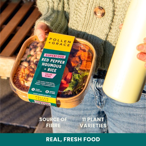 Pollen + Grace creates feel-good food packed with natural ingredients designed for convenience and flavour since 2015. This Superfood Red Pepper Houmous Rice Salad Bowl offers a simple way to enjoy a nutritious lunch or light dinner.