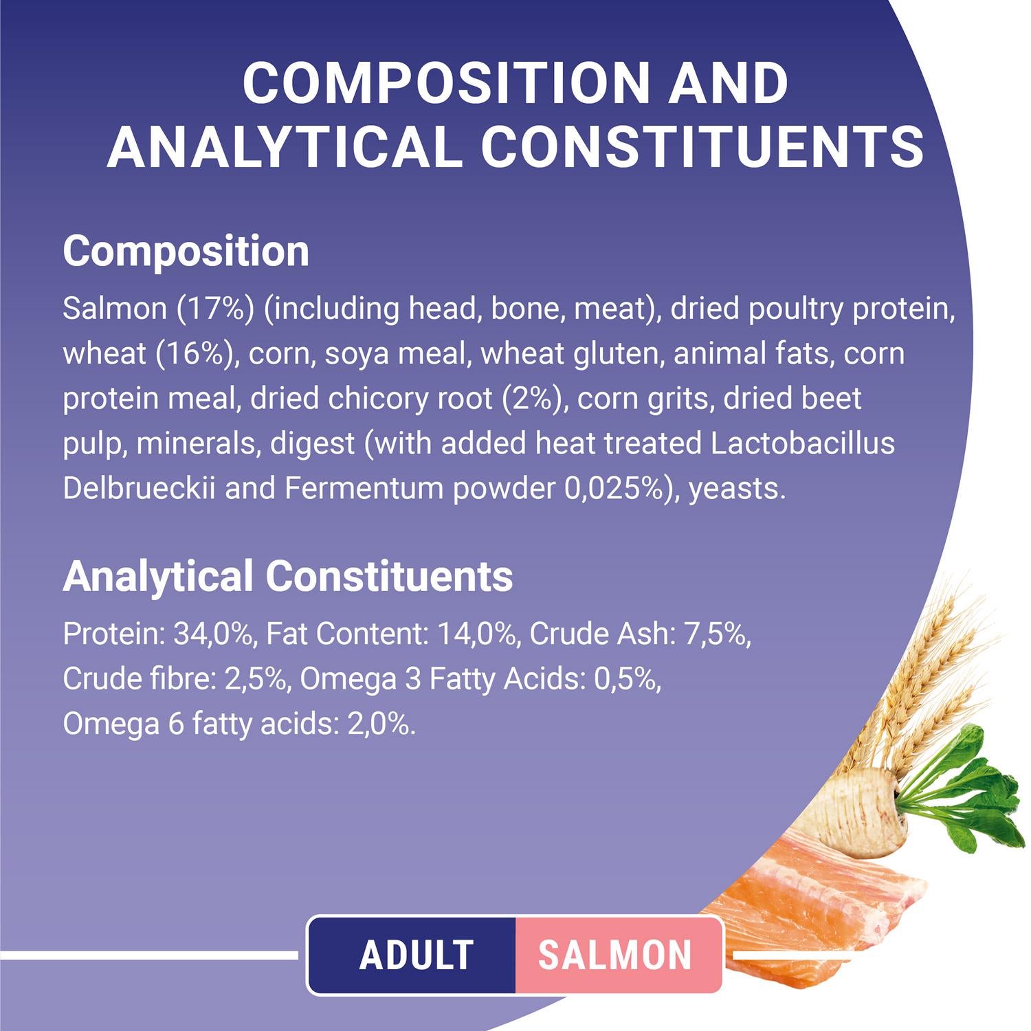 Salmon is the #1 ingredient – a good source of protein and amino acids to help build and maintain strong muscles