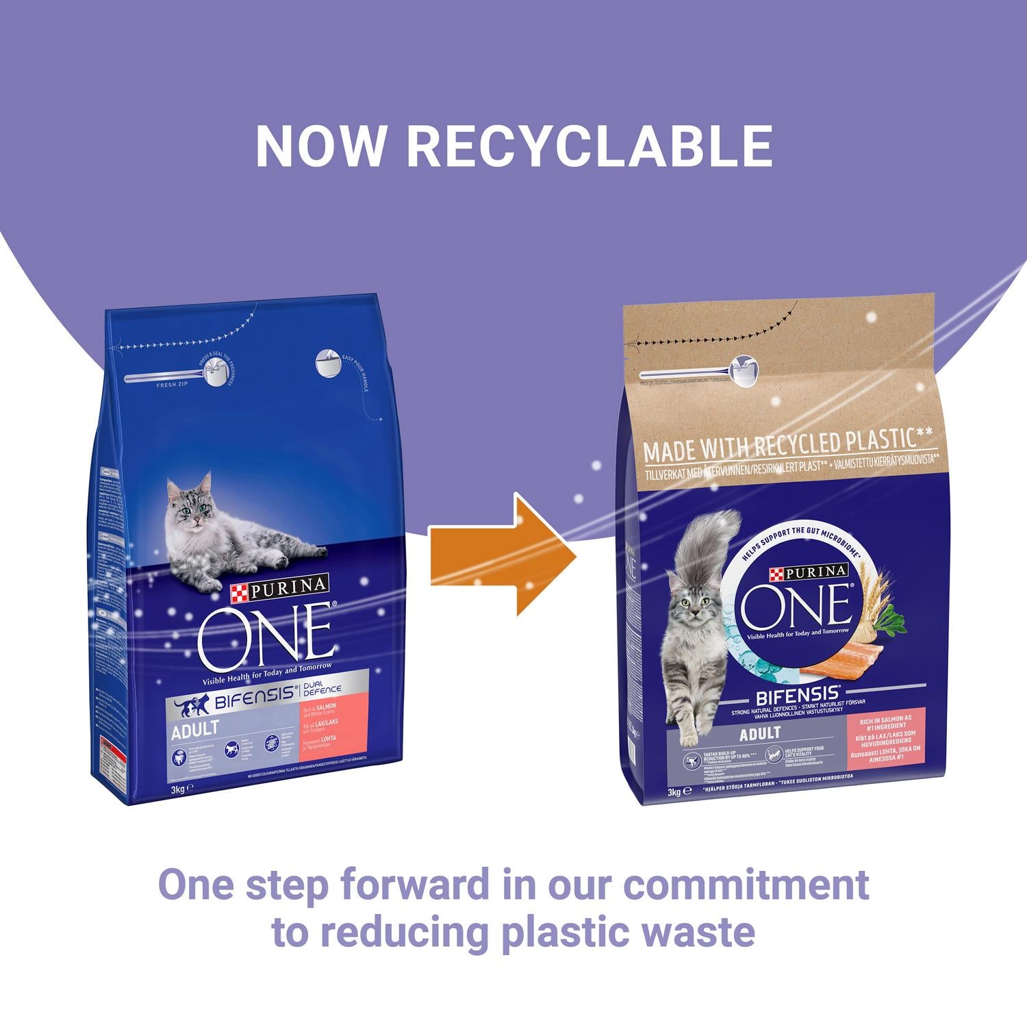 VISIBLE HEALTH FOR TODAY AND TOMORROW PURINA ONE® Adult is nutritionally tailored for cats aged 1 year and over Having a balanced gut microbiome is essential for the good health of your cat. It has a direct impact on their natural defences. The microbiome is an ecosystem containing trillions of microorganisms that live in the gut and are unique to each cat. The balance of microorganisms is important to make positive effect on your cat’s digestive health, natural defences, and overall well-being. PURINA ONE® BIFENSIS® is nutritional formula with a beneficial functional bacteria: Lactobacillus, scientifically proven to strengthen your cat’s natural defences from the inside out and helps protect a healthy gut microbiome. Purina ONE® BIFENSIS® contains high-quality ingredients, including prebiotic: chicory, which nurtures good bacteria in the gut to improve your cat’s gut microbiome for maintaining your cat in a good health. From a healthy digestion and strong natural defences to a shiny coat you can see visible results on your cat’s health today and tomorrow. Scientifically proven to strengthen your cat’s natural defences thanks to lactobacillus - specific functional bacteria Improves gut microbiome balance thanks to chicory, a prebiotic Salmon is the #1 ingredient – a good source of protein and amino acids to help build and maintain strong muscles Proven to reduce tartar build-up by up to 40%* *Purina research Helps maintain a healthy urinary tract Helps to keep skin and coat in glowing health thanks to Omega 3 & 6 fatty acids and essential vitamins and minerals