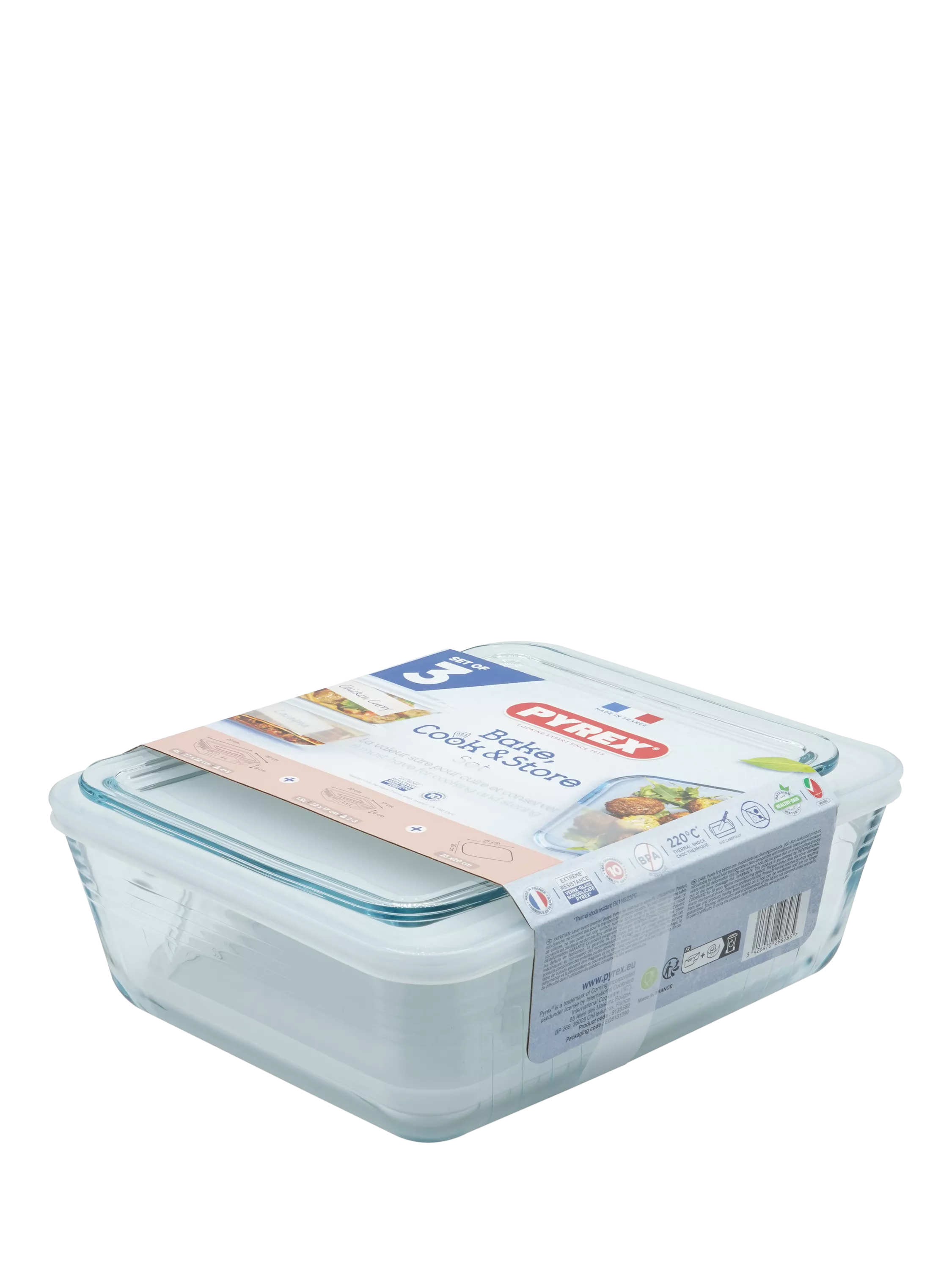 Ensemble Pyrex de trois pièces comprenant deux plats de conservation en verre borosilicate avec couvercles et un petit plat à four en verre borosilicate. Idéal pour la cuisson, la préparation de gâteaux et la congélation, avec des proportions optimales et un encombrement minimal.