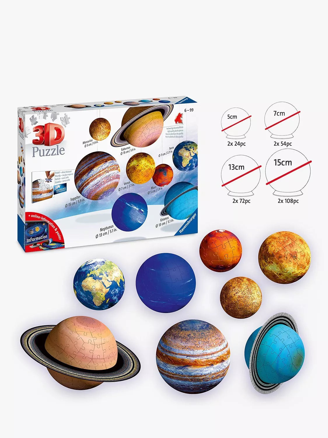Les puzzles 3D sont dimensionnés pour représenter les différentes tailles des planètes : Saturne et Jupiter sont représentés par des puzzles de 108 pièces, Uranus et Neptune par des puzzles de 72 pièces, la Terre et Vénus par des puzzles de 54 pièces et Mars et Mercure par des puzzles de 27 pièces, pour un total de 522 pièces.