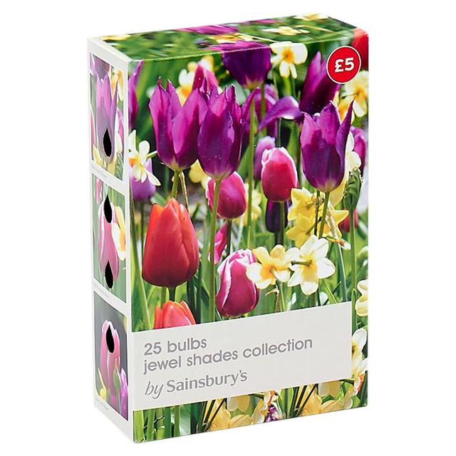 Product details Description 25 bulbs jewel shades collection by Sainsbury's n/a 2 Tulipa lily flowering Purple Dream, 3 Tulipa triumph Synaeda Blue, 2 Tulipa triumph Leo Visser, 3 Tulipa triumph Purple Flag, 3 Tulipa triumph Jimmy & 12 Narcissus jonquilla Mixed. Country of Origin Packaging Manufacturer Customer rating (1) Read More