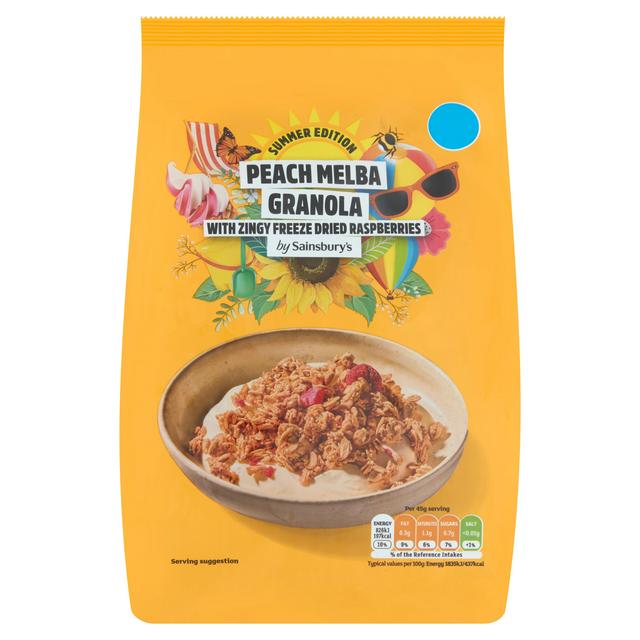 Sainsburys Peach Melba Granola Summer Edition 500g offers a truly delightful breakfast experience. It combines honey toasted wholegrain oats with sweet peach flavouring notes. Enjoy the bright, zingy texture of freeze-dried raspberries throughout this delicious summer blend. This cereal is ready for your morning bowl each day now.