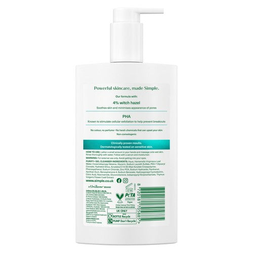 Simple Purify+ Gel Facial Cleanser targets excess oil and helps keep pores clear for visibly healthier skin. This advanced formula uses key ingredients to manage blemishes and refine texture effectively.