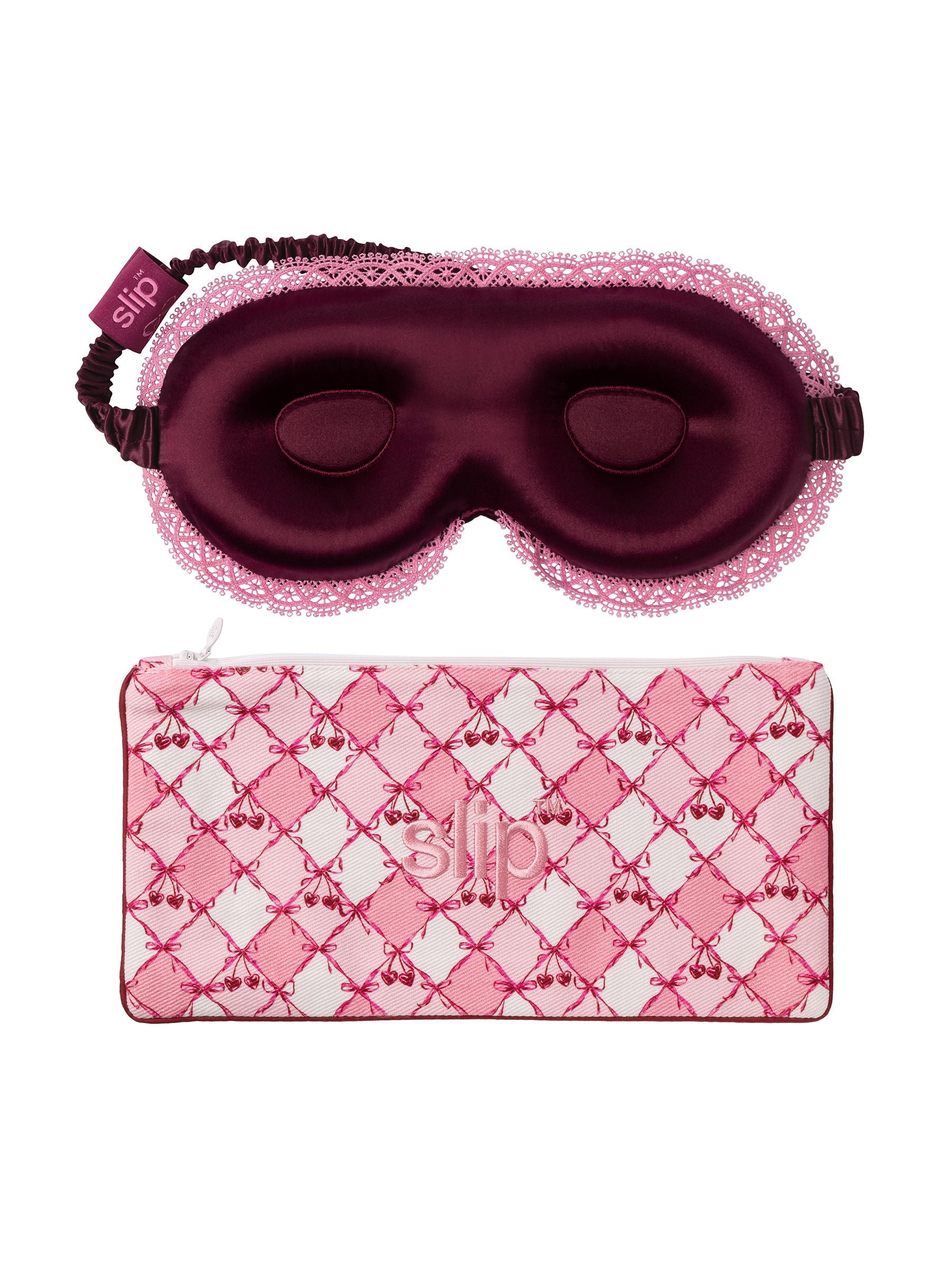 Comprend 1 masque de sommeil contour en pure soie cramoisie avec bordure en dentelle et broderie (8,5 cm x 20,5 cm) et 1 pochette de voyage offerte (27 cm x 13,5 cm).