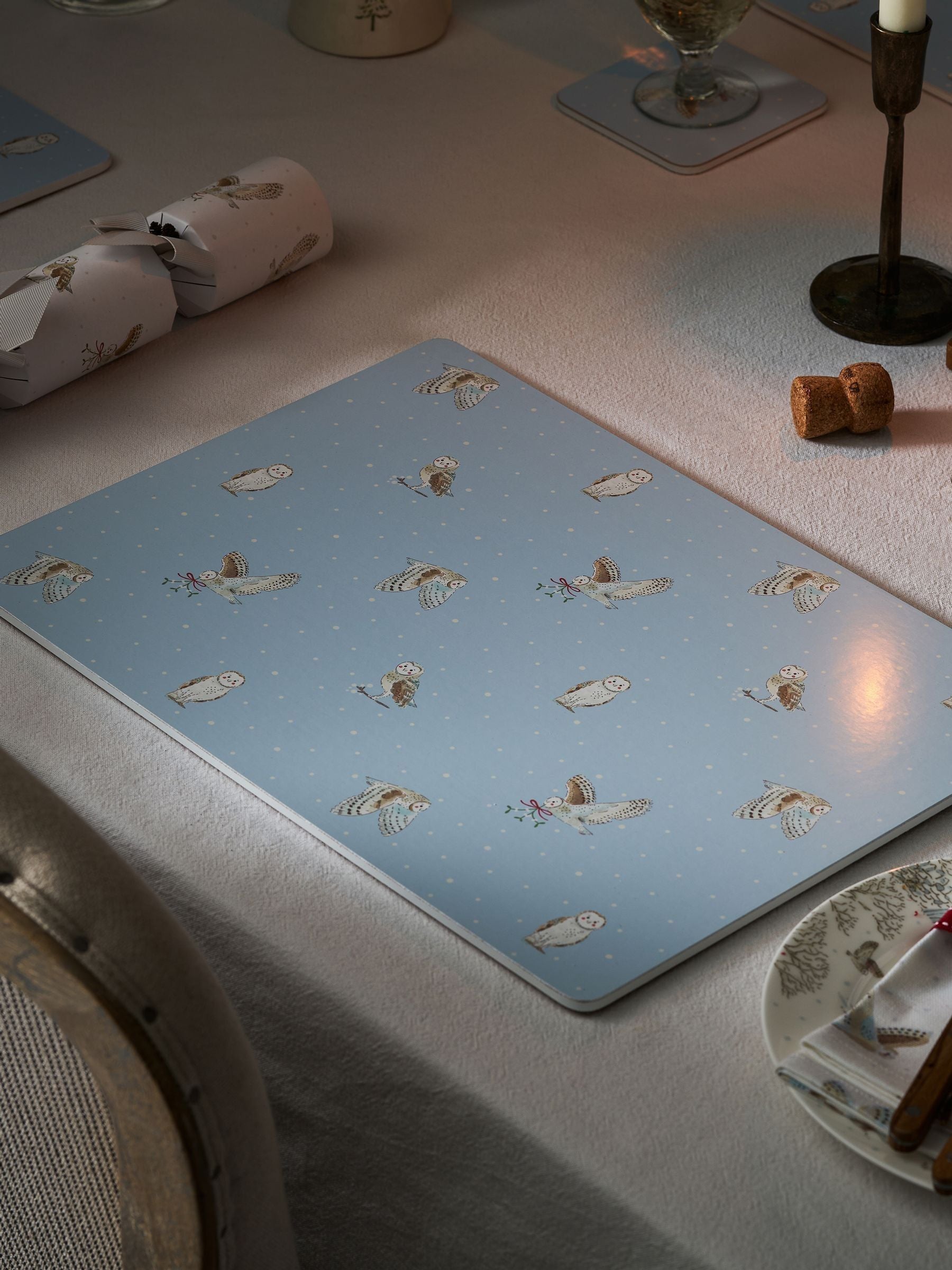 Ces sets de table extra-larges en liège arborent un élégant motif de chouettes des neiges sur un fond bleu clair. Idéaux pour protéger votre table tout en y ajoutant une touche festive, ils constituent un accessoire à la fois élégant et pratique pour votre table de Noël. Lot de 2. Dimensions : H 29 x L 40 x P 0,5 cm. Fabriqués en liège avec une surface laquée mate. Résistants à la chaleur jusqu'à 110 °C. Bordure bleu clair. Le motif peut légèrement varier. Articles assortis disponibles dans la collection Chouettes des neiges.