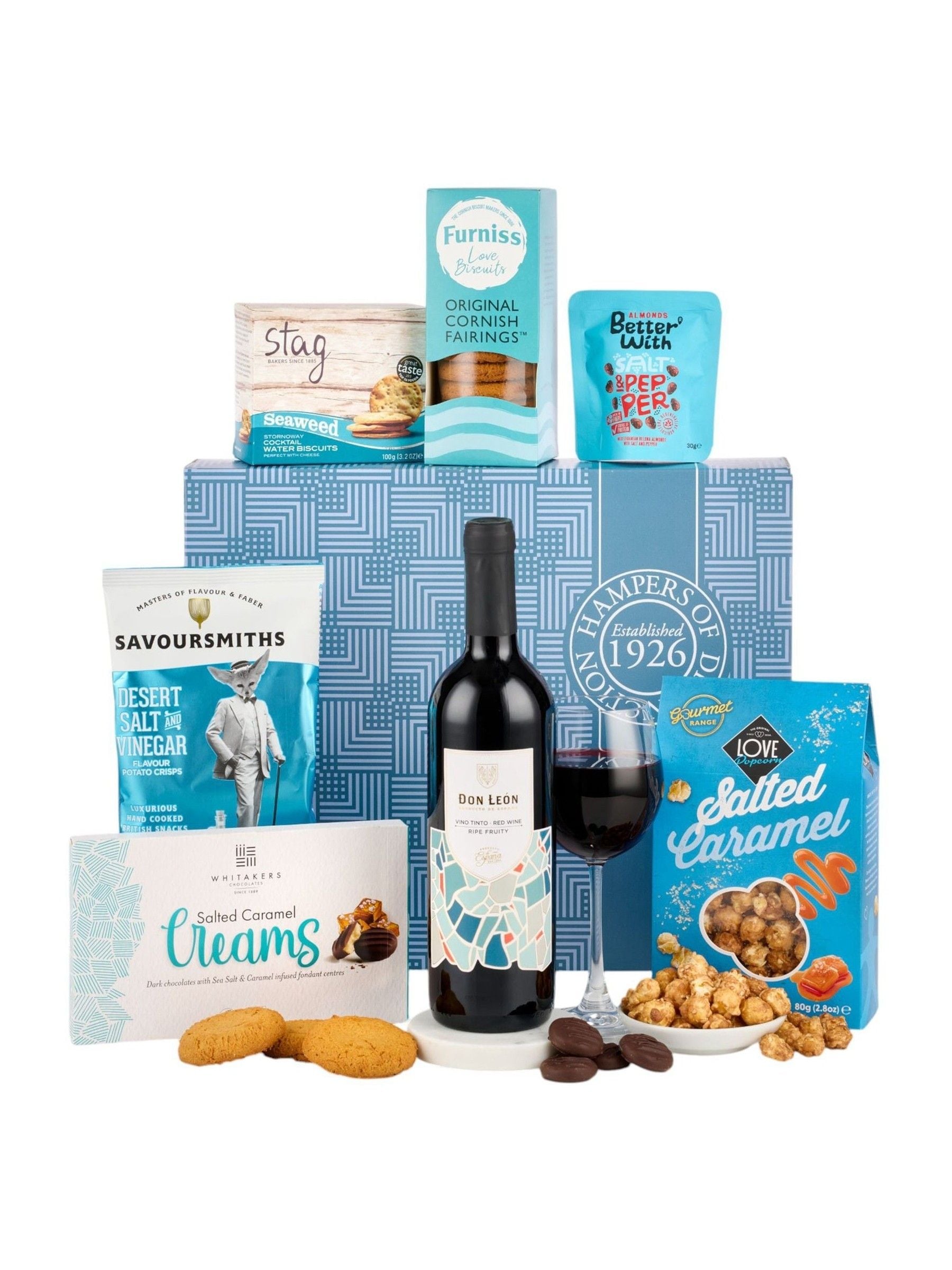 Vin rouge espagnol Don Leon 75 cl. Biscuits Furniss Original Cornish Fairings 180 g. Crèmes au caramel salé Whitakers 150 g. Sel et vinaigre du désert Savoursmith 40 g. Popcorn au caramel salé Love Popcorn 100 g. Amandes Better With Sel et Poivre 30 g. Biscuits apéritifs Stag Cocktail aux algues 100 g. Présenté dans un coffret cadeau à motifs géométriques.