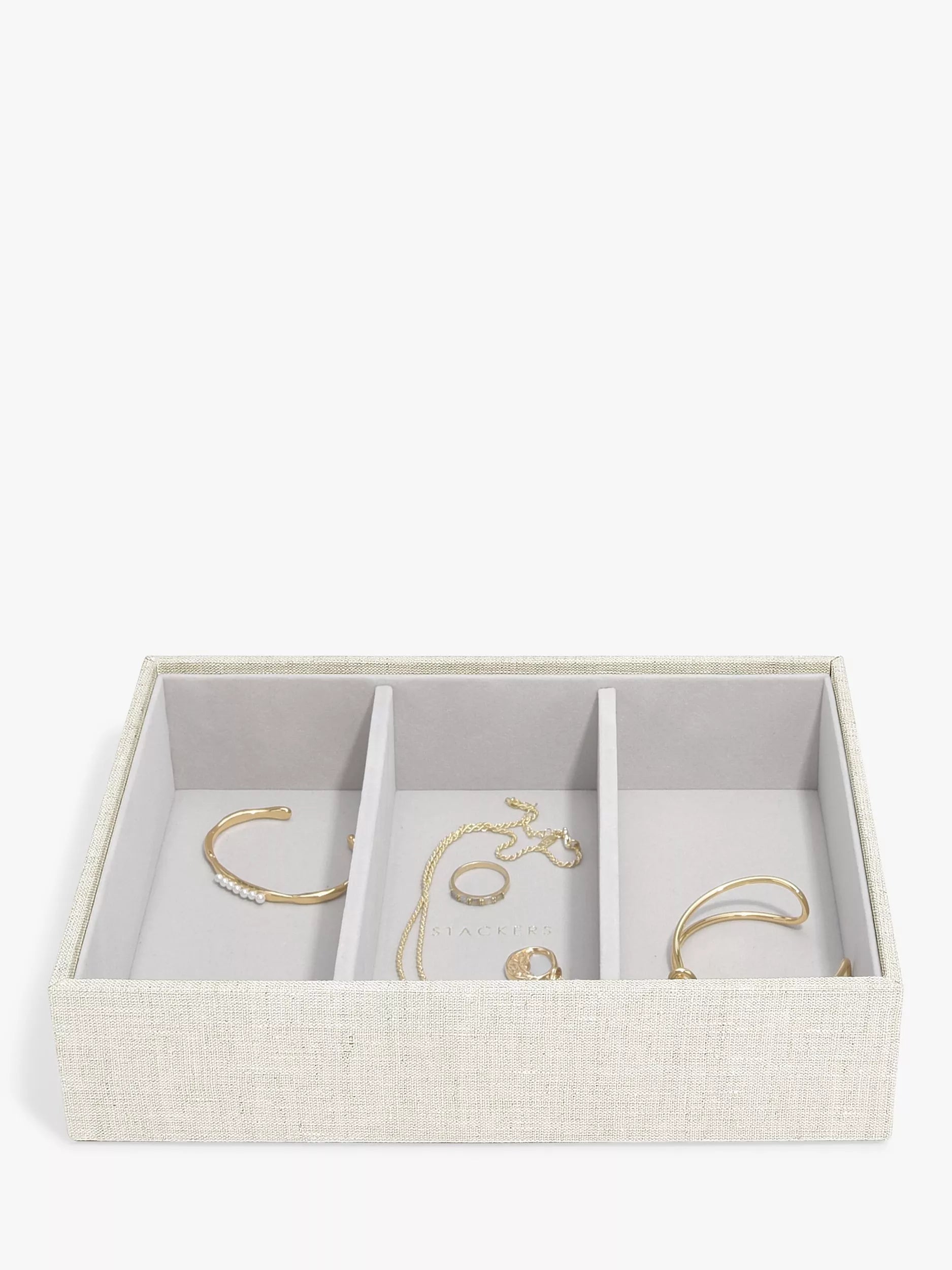 Le compartiment « Montres et Accessoires » est plus profond et conçu pour accueillir montres et accessoires volumineux dans ses trois sections. Ajoutez-le à votre boîte à bijoux Stackers ou utilisez-le comme rangement indépendant sur une commode ou dans un tiroir. Pour encore plus d'options de rangement, vous pouvez également ajouter un étui à bagues, un support pour montres ou une boîte à bijoux de voyage moyenne afin de ranger vos bijoux en toute sécurité.