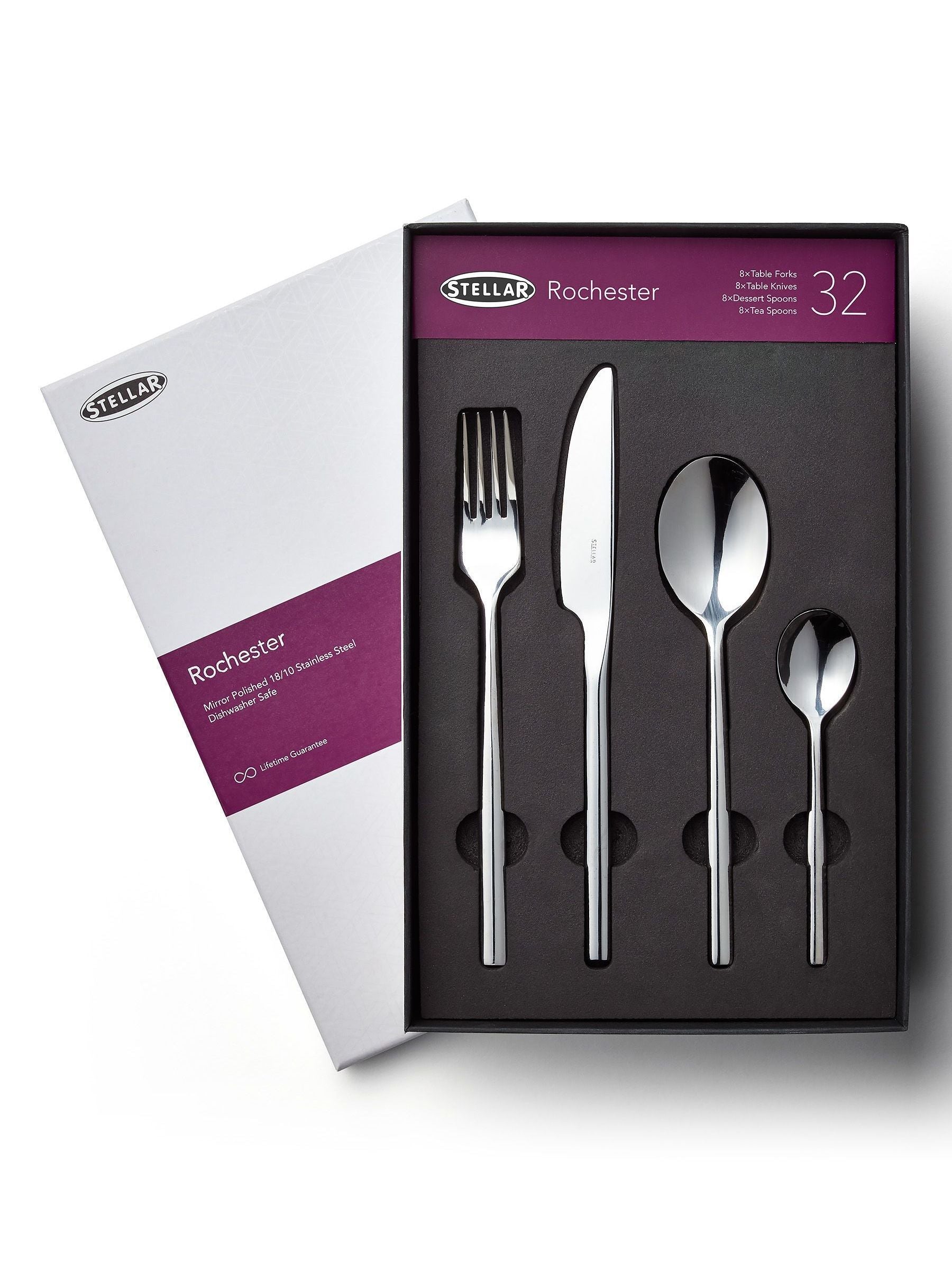 The Stellar Rochester Cutlery range has an elegant, modern design to add style to any dining occasion. Crafted from highquality 18/10 mirrorpolished stainless steel, this beautiful cutlery is the perfect gift or to simply enjoy at home. This set comes with 8 table knives, 8 table forks, 8 dessert spoons, 8 tea spoons in an attractive gift box. Complete with the Stellar Lifetime Guarantee.