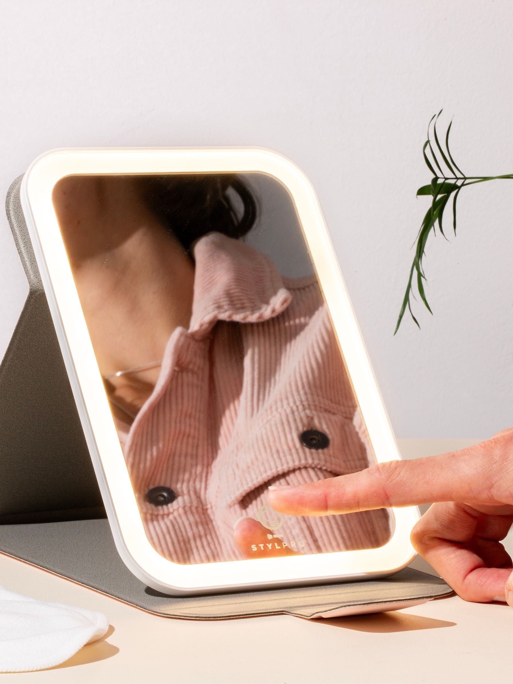 Le miroir de voyage STYLPRO On Tour est un miroir léger, fin et portable, doté de panneaux lumineux LED à intensité variable pour un éclairage parfait lors de l'application du maquillage. BRILLEZ DE MAINTENANT, VOYAGER EN TOUTE LÉGÈRETÉ. Transformez chaque retouche en un moment glamour avec le miroir de voyage STYLPRO On Tour Petite. Se préparer en déplacement n'a pas besoin d'être compliqué ; laissez notre miroir de voyage ultra-pratique vous simplifier la vie. Ce miroir portable et léger est doté d'un étui de protection pliable qui sert également de support vertical ou horizontal, et il est équipé de LED intégrées pour une visibilité optimale à toute heure de la journée. Choisissez parmi 3 réglages d'intensité lumineuse (appui long) : lumière vive, chaude et froide, facilement interchangeables en quelques clics. Mieux encore, le miroir est rechargeable par micro-USB (câble inclus), vous n'aurez donc pas à vous soucier des piles.