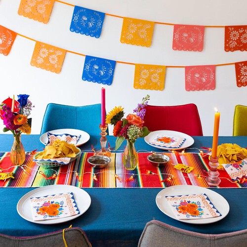 • The vibrant design suits summer BBQs, dinner parties, or boho birthday celebrations.