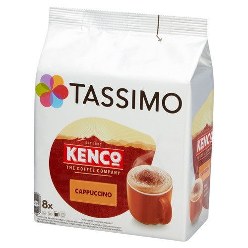 Experience the classic Kenco Cappuccino conveniently prepared for your Tassimo machine. This option delivers a consistently smooth and well-balanced coffee taste topped with rich, frothy foam.