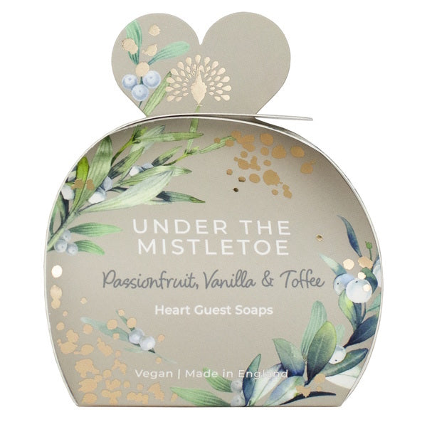 Coffret de 3 savons en forme de cœur (20 g chacun) - Parfum : Ananas, citron et mandarine - Non testé sur les animaux et végan - Emballage sans plastique et entièrement recyclable - Fabriqué en Angleterre. Offrez-vous un moment de luxe festif avec les savons en forme de cœur « Sous le gui » de notre collection « Vœux de Noël ». Ce magnifique coffret cadeau, orné de gui et de petits bouquets de baies blanches, contient trois mini savons en forme de cœur. Une dorure scintillante ajoute une touche de magie, en faisant le cadeau idéal à glisser dans une chaussette de Noël, à offrir à vos invités ou à vous faire plaisir. Les savons « Sous le gui » sont parfumés de notes vivifiantes d'ananas, de citron et de mandarine, avec un cœur de fruit de la passion, de mûre et de cumin épicé. Le tout se fond sur un fond riche de patchouli, de vanille, de caramel et de muscs.