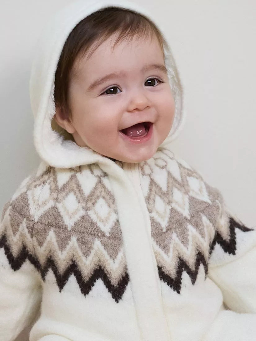 Enveloppez votre tout-petit de douceur et de confort avec cette adorable combinaison bébé à capuche en maille Fair Isle. Parfaite pour le garder bien au chaud tout au long de l'automne et de l'hiver, cette pièce luxueuse offre un confort et un style incomparables.