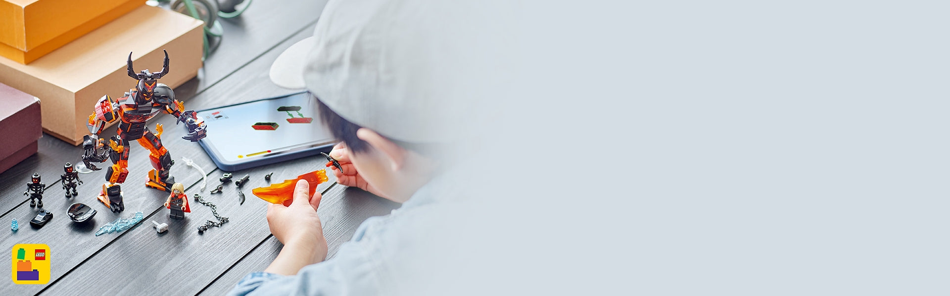 The set includes 3 minifigures: Thor and 2 fire demon warriors. As in the movie, Thor breaks free from the chains that bind him and battles Surtur. The jointed, buildable Surtur figure can be positioned in different action poses. He wields a large fire sword and wears a horned crown. A transparent connector lets kids attach the Thor minifigure to the buildable Surtur so that it looks like the Avenger is flying. For added digital fun, builders can zoom in, rotate models in 3D and track their progress using the intuitive LEGO Builder app.