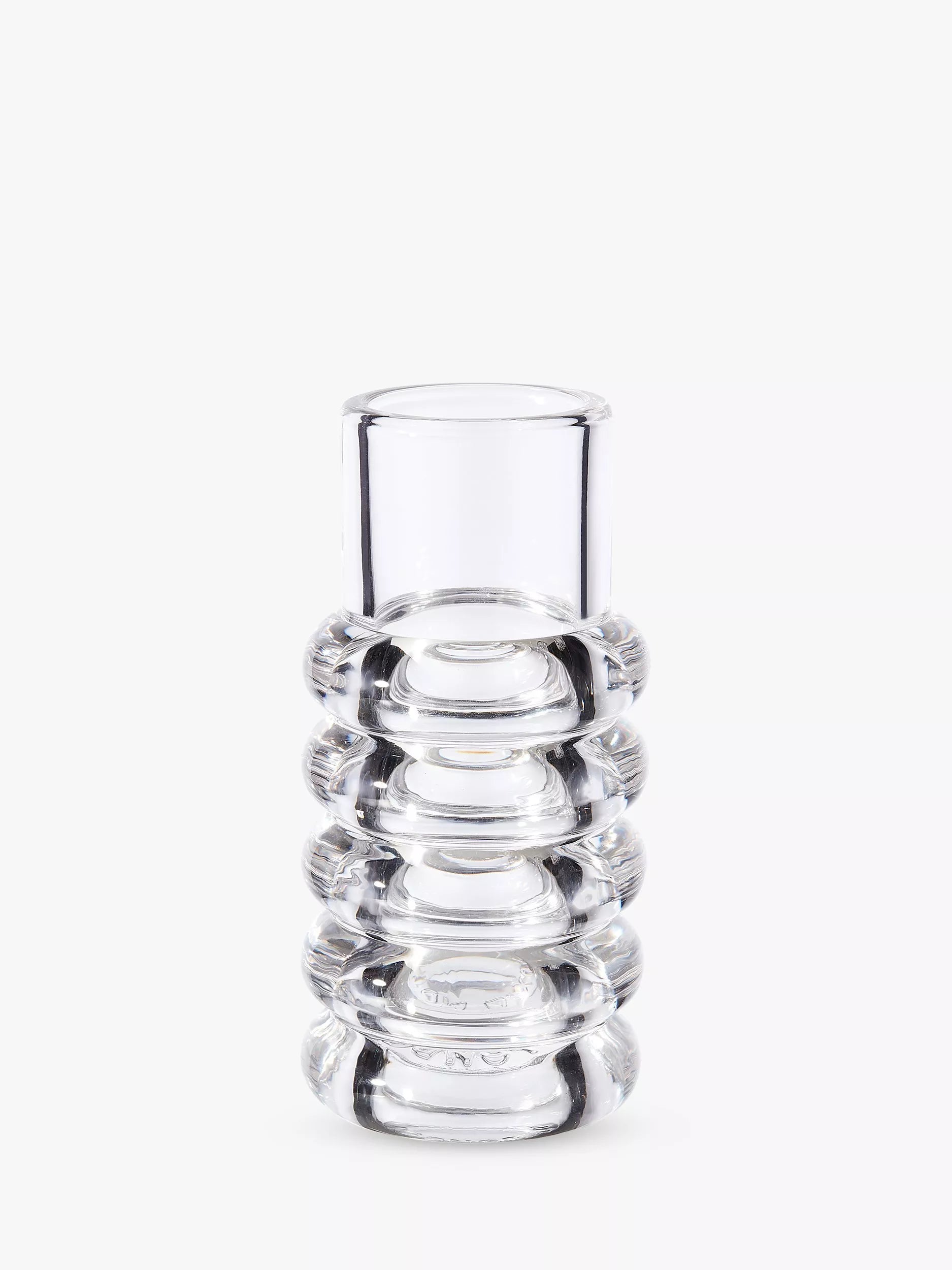 Ce vase, issu de la collection Press de Tom Dixon, est fabriqué en verre épais pressé industriellement dans un moule en fer. Sa conception ingénieuse crée un jeu de lumière kaléidoscopique grâce à la réfraction de la lumière par les nervures centrales. Ce simple ajout de nervures confère à la forme traditionnelle de la colonne une allure résolument moderne, créant l'illusion de tiges courbées à travers le vase.