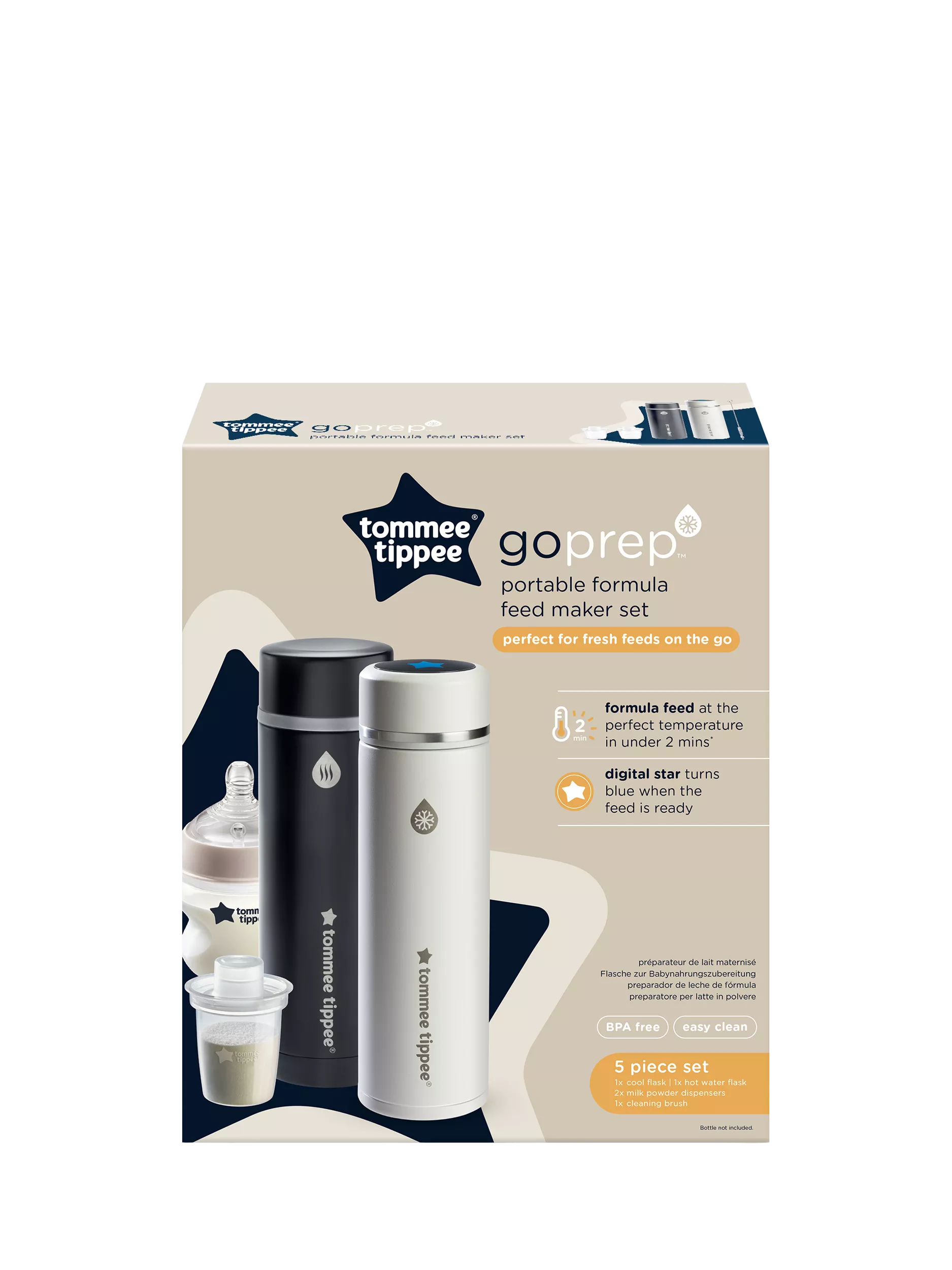 Tommee Tippee accompagne les parents dans leur aventure et c'est pourquoi le kit GoPrep pour biberons est spécialement conçu pour simplifier l'heure du repas. Doté d'un thermos pour boissons chaudes et d'un thermos innovant pour boissons froides, le kit GoPrep vous permet de préparer des biberons frais en seulement deux minutes*, même en déplacement.