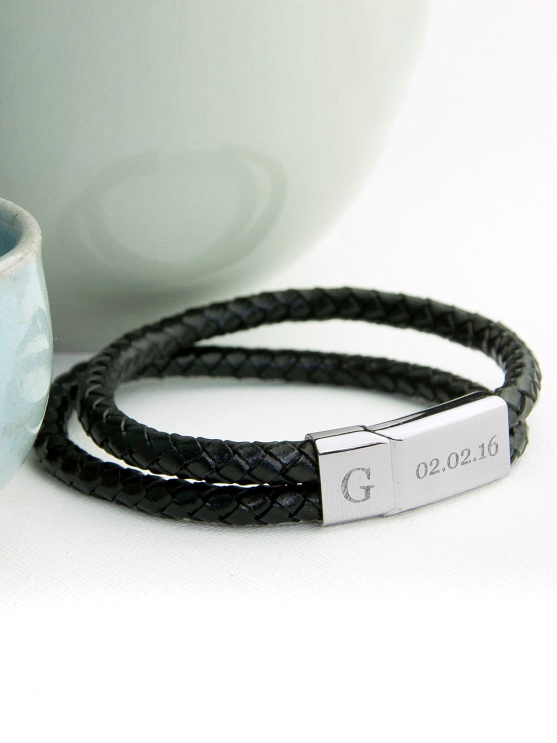 This dual leather woven bracelet in a stylish black can be personalised in two ways, initials and a short message.